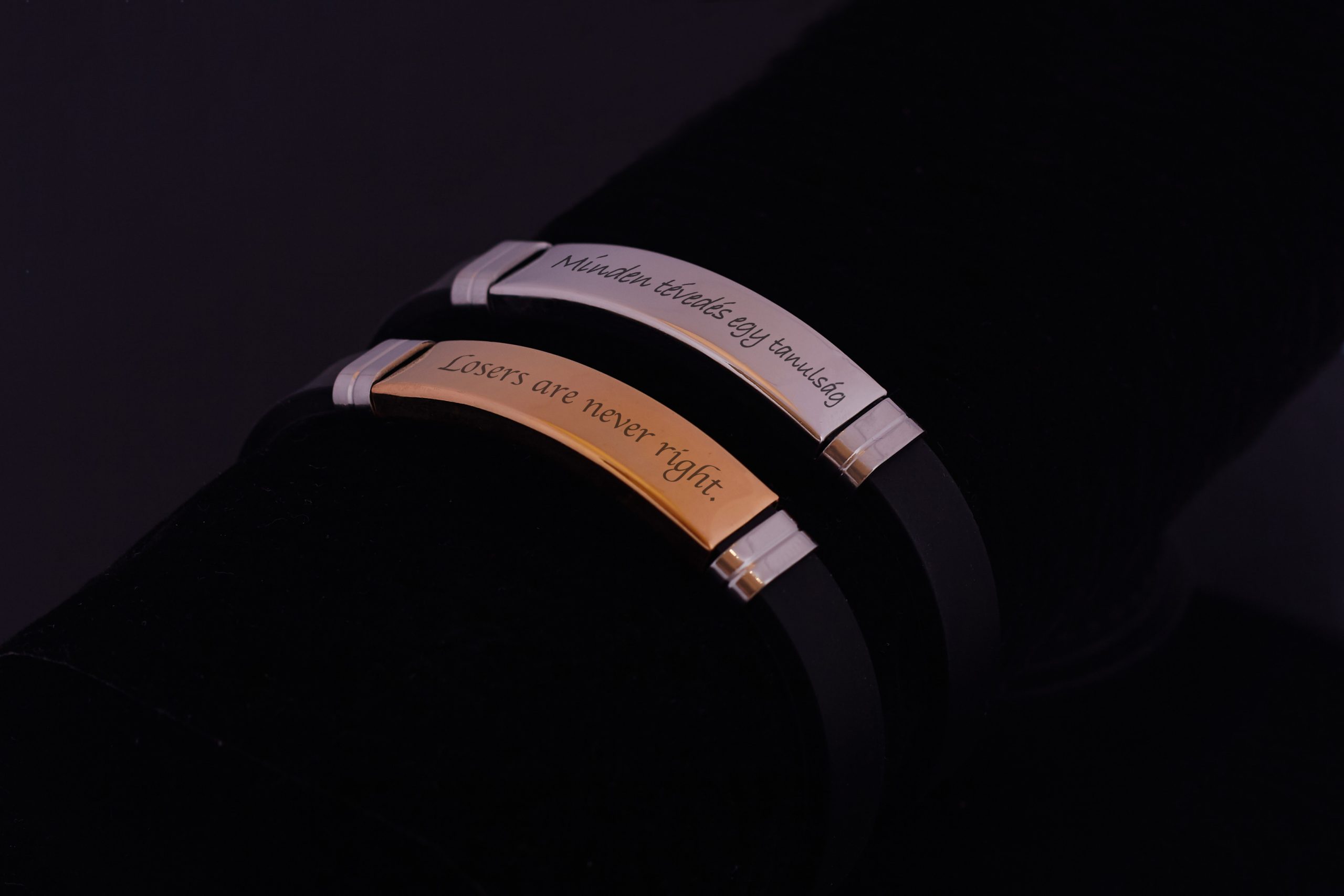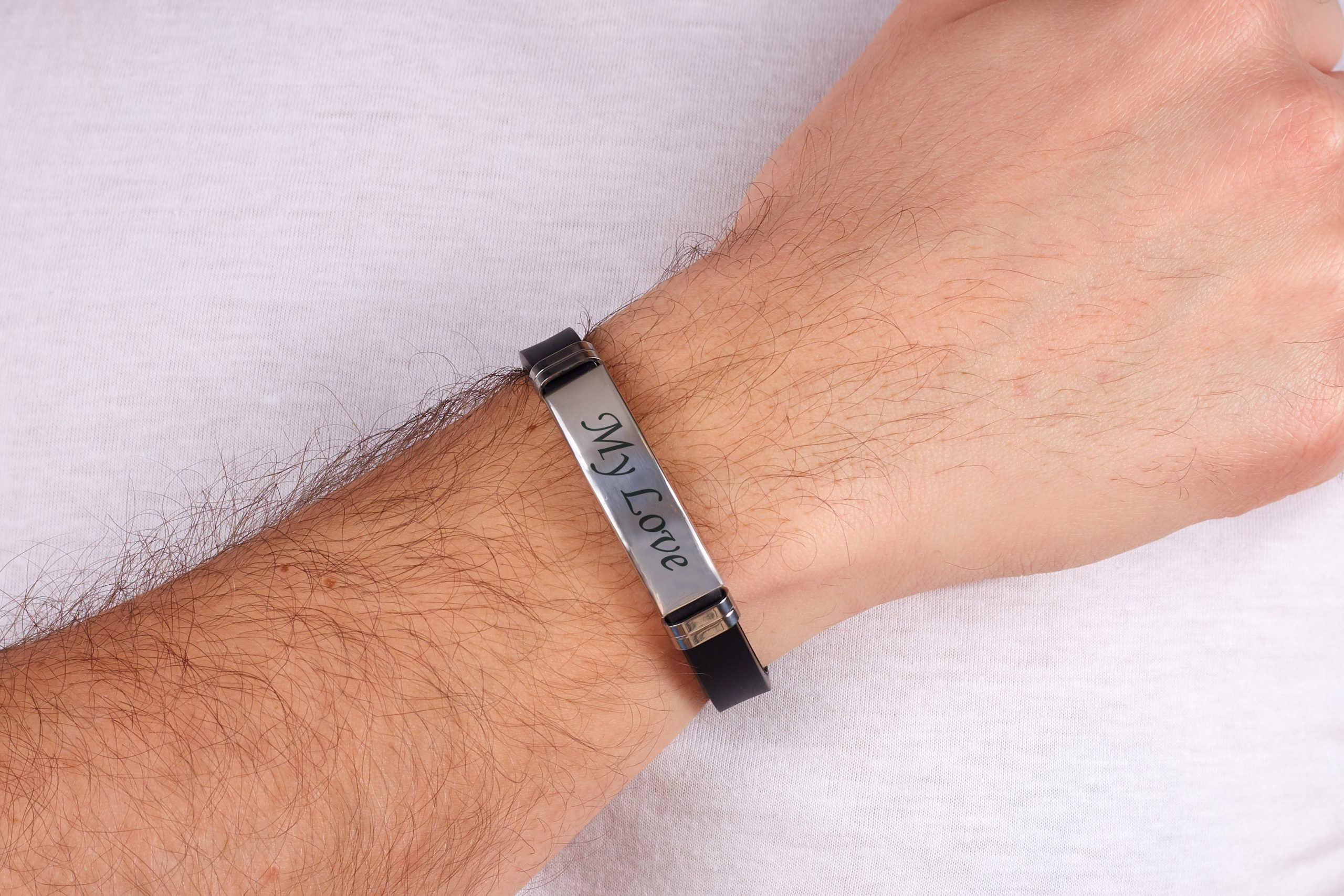 Férfi karkötőnk rozsdamentes acélból készült, mely egy szilikon pánton van rajta. Így ez egy masszív és kiváló minőségű termék, melyet az egyedi gravírozás igazán különlegessé tesz.